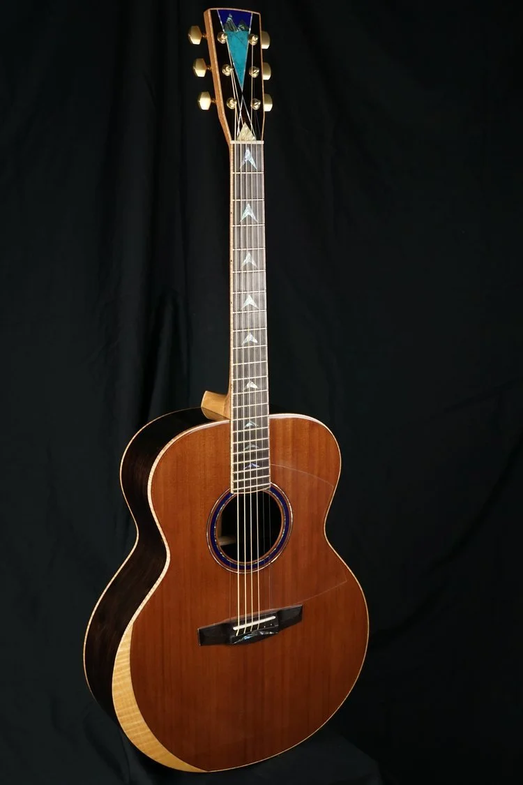 This is a really unique custom instrument for a customer who is a fan of St. Lucia (the island) and wanted a guitar that expresses that feeling. Every detail is a product of that collaboration. We started with a small jumbo sized instrument with African Blackwood and Redwood. We also designed the custom inlays that show off the Pitons, St. Lucia’s iconic mountains, in abalone and reconstituted stone as well as inlays that express the shape of the St. Lucia flag. That motif is carried down the fretboard in abalone and all the way to the custom pinless bridge that also boasts a bright burst of abalone. There is an arm bevel and binding in beautifully flamed maple and that is dressed up with gold hardware and EVO gold fretwire. I really like the asymmetrically carved heel and back of the headstock. The final touch was the installation of a K&K Pure Pickup. I also want to thank KOZM Guitars for lending his services in cutting the bulk of the inlays which saved me many hours work hunched over cutting inlays by hand.